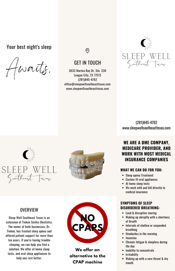 Sleep Well Southeast Texas is dedicated to providing sleep apnea treatment using custom-made oral appliances. Our goal is to help our patients get the rest they need to enjoy a healthier quality of life as well as a more comfortable night’s sleep. Please review our brochure for more details about sleep apnea and our treatment options. If you have any questions, we invite you to call us at 281-845-4792 to schedule a consultation with our dental sleep specialist in League City, Texas, Dr. Tieken.